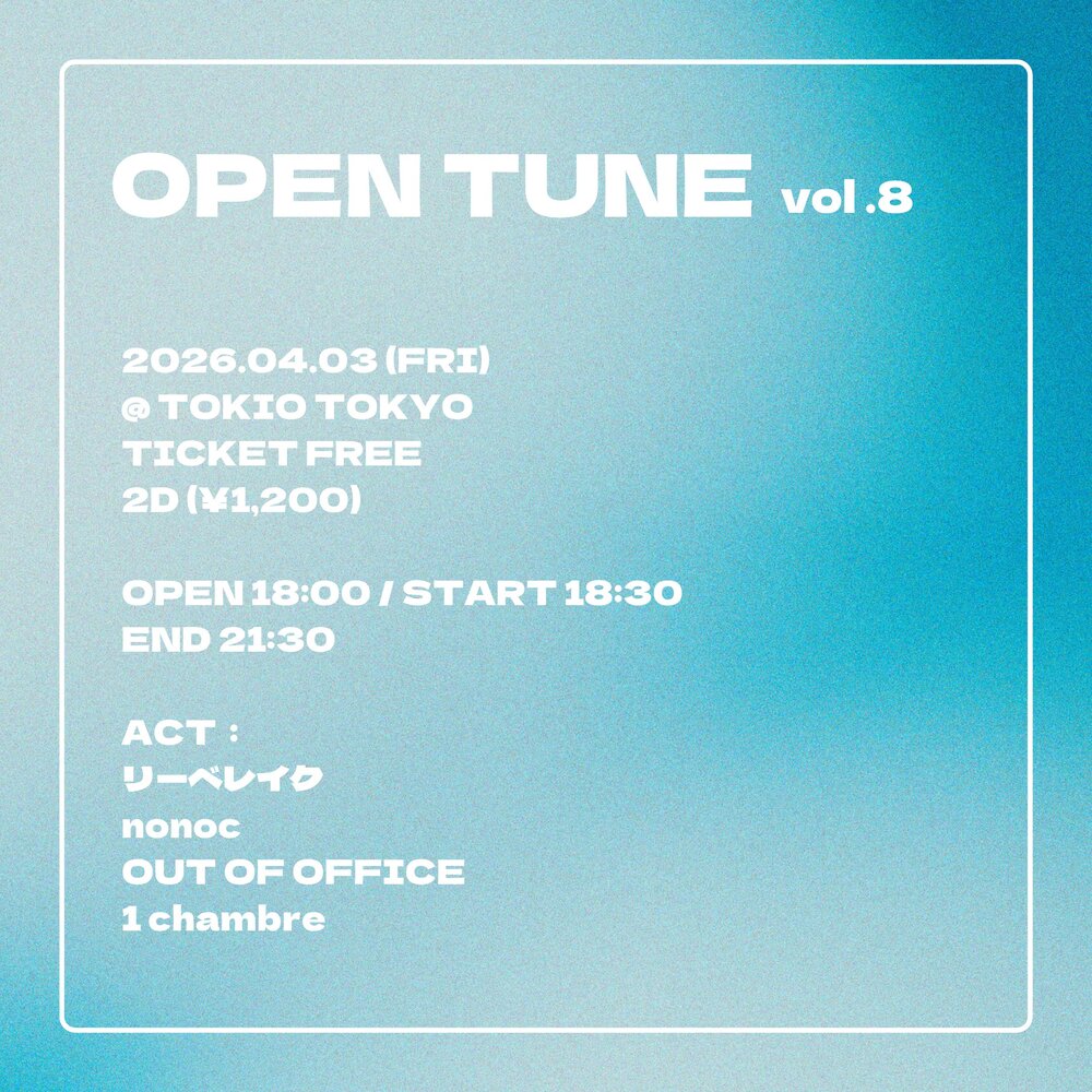 OPEN TUNE vol.8 SCHEDULE 2026/04/03(金) TOKIO TOKYO 地図を表示 OPEN 18:00 / START 18:30 OPEN TUNE vol.8 2026/04/03(Fri) OPEN 18:00 / START 18:30 TICKET FREE + 2D(¥1,200) 《出演》 ・リーベレイク ・nonoc ・OUT OF OFFICE ・1chambre ▼ご予約 https://forms.gle/yjBHCnbR8SudRtpW7 ▼ご予約 URLをコピーする 報告する